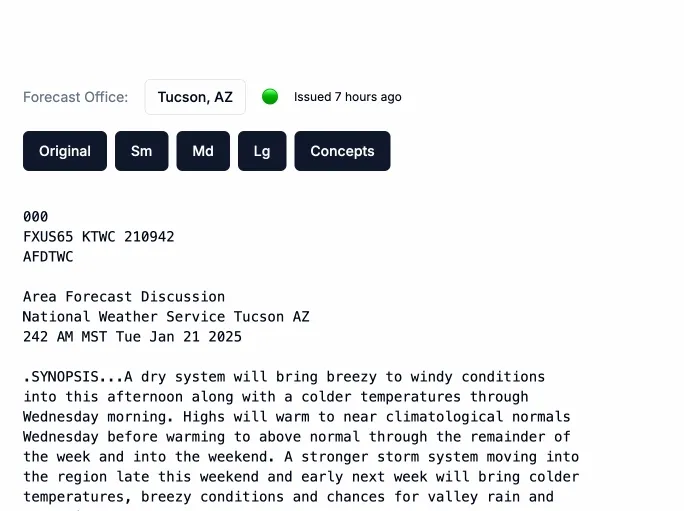 Recently, I built a small app to help me better understand the weather in my new home of Tucson, Arizona. The app lets me read and interact with the National Weather Service's Area Forecast Discussion (AFD) — a technical but conversational document where meteorologists explain their forecast reasoning. While building it, I stumbled onto something interesting about how AI might help us learn in more natural and effective ways.
